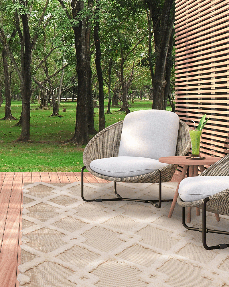 Prefect for the garden or indoors; our new Monty range features modern geometric and tribal designs. Woven from weather resistant yarns in a high-low pile for added cosy texture and warmth.