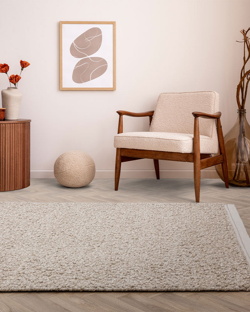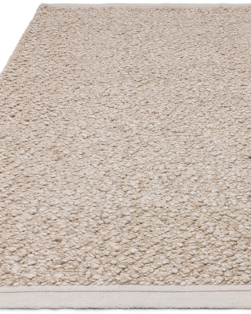 Elm combines a chunky boucle texture with a durry inspired border, complimented by a subtle stitch detail. Featuring varied size boucle weaves.