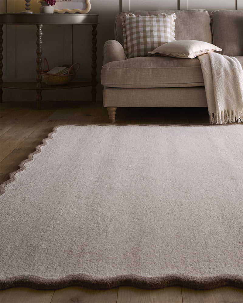 Our Scalloped Elsie rug has a cut out scalloped border , in a complementary colour. Its wool composition provides a luxury feeling underfoot whilst it's fun design adds a touch of interest to any home.
