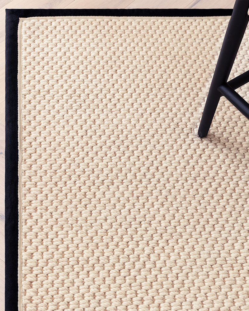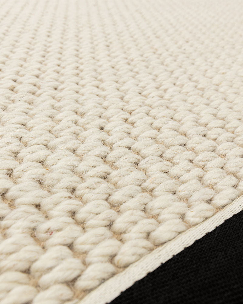 Korra is made on a traditional loom from jute and twisted woollen loops, framed with a cotton border. The double loop construction combines jute with a higher proportion of wool to create a softer feel underfoot.