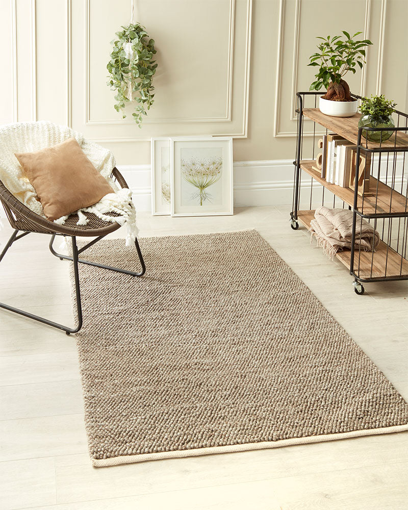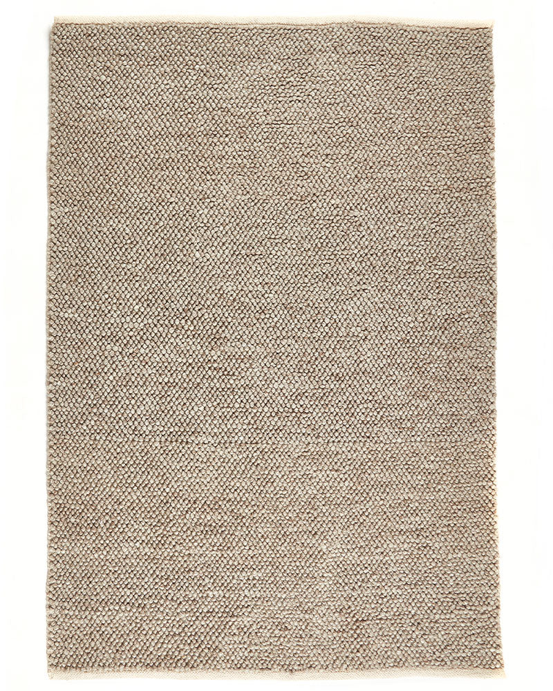 Hand woven with a bubbly texture, this beautiful rug is crafted from durable wool yarn. The neutral tones and tactile texture give the rug a warm and modern aesthetic.