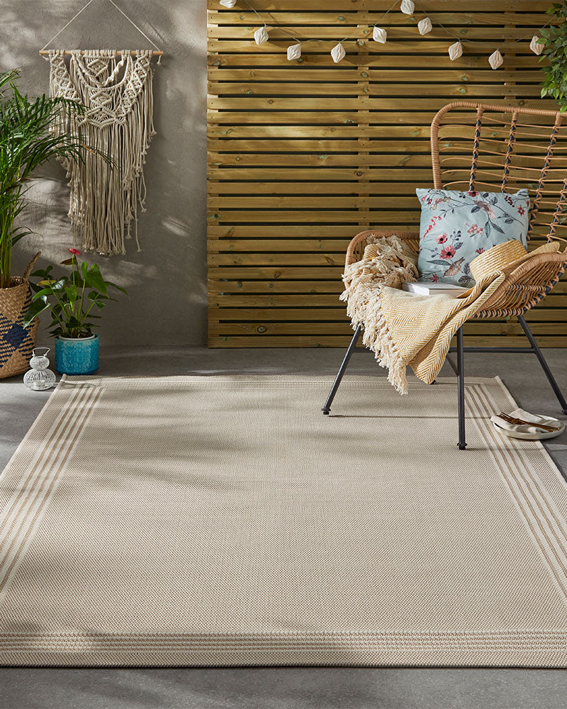 The Terrazzo collection features a chic border design suitable for indoor or outdoor use. The 100% polypropylene weave is incredibly durable, stain-resistant and weatherproof.