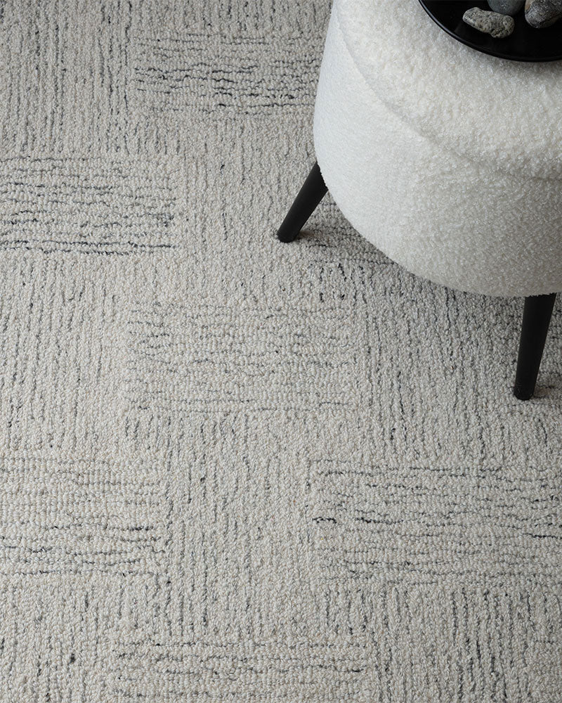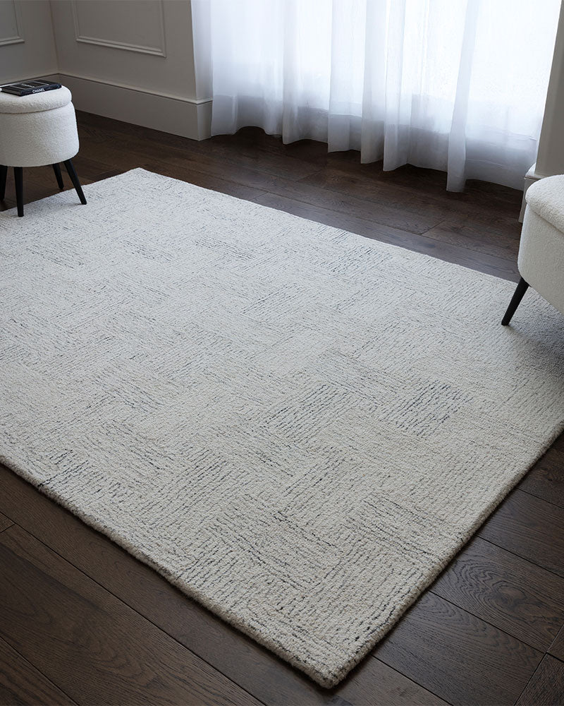 Theodore features a distinctive combination of loops and tonal woollen yarns, expertly hand tufted in chevron and cross hatch patterns.