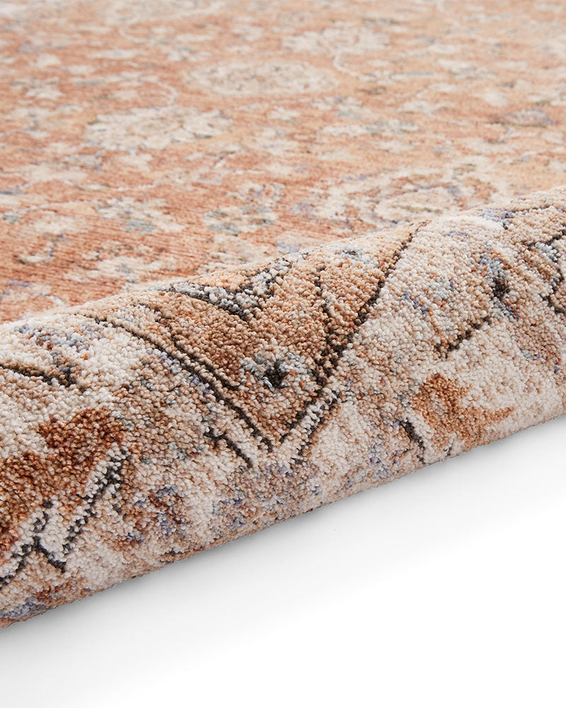 Vintage by Think Rugs is a collection of traditional designs in a contemporary muted palette. A classic central Kashan medallion is bordered with intricate floral patterns. Made from soft touch polypropylene and finished off with a short fringe.
